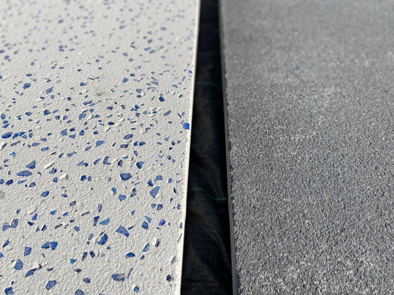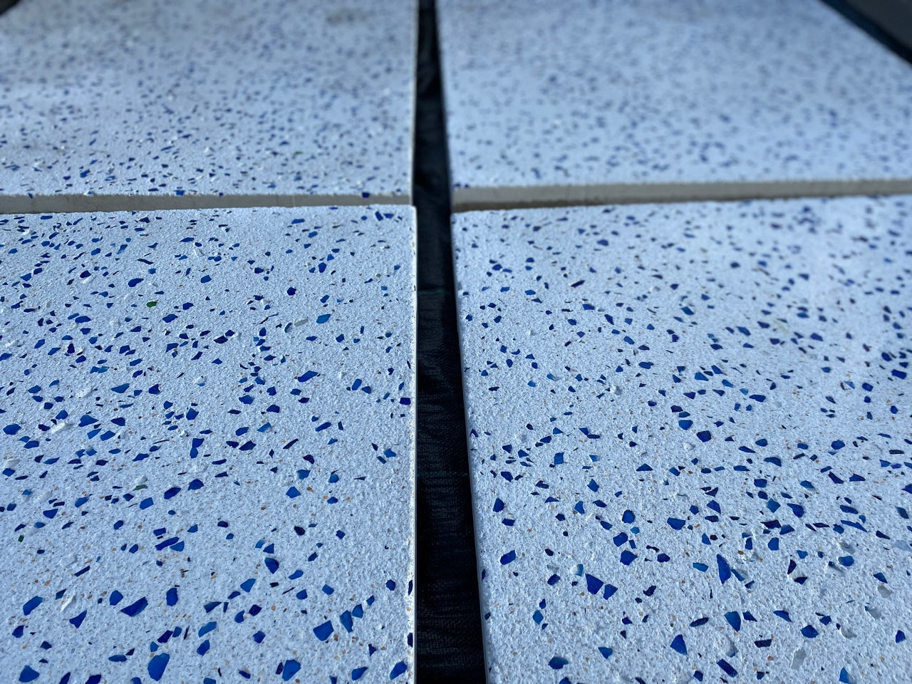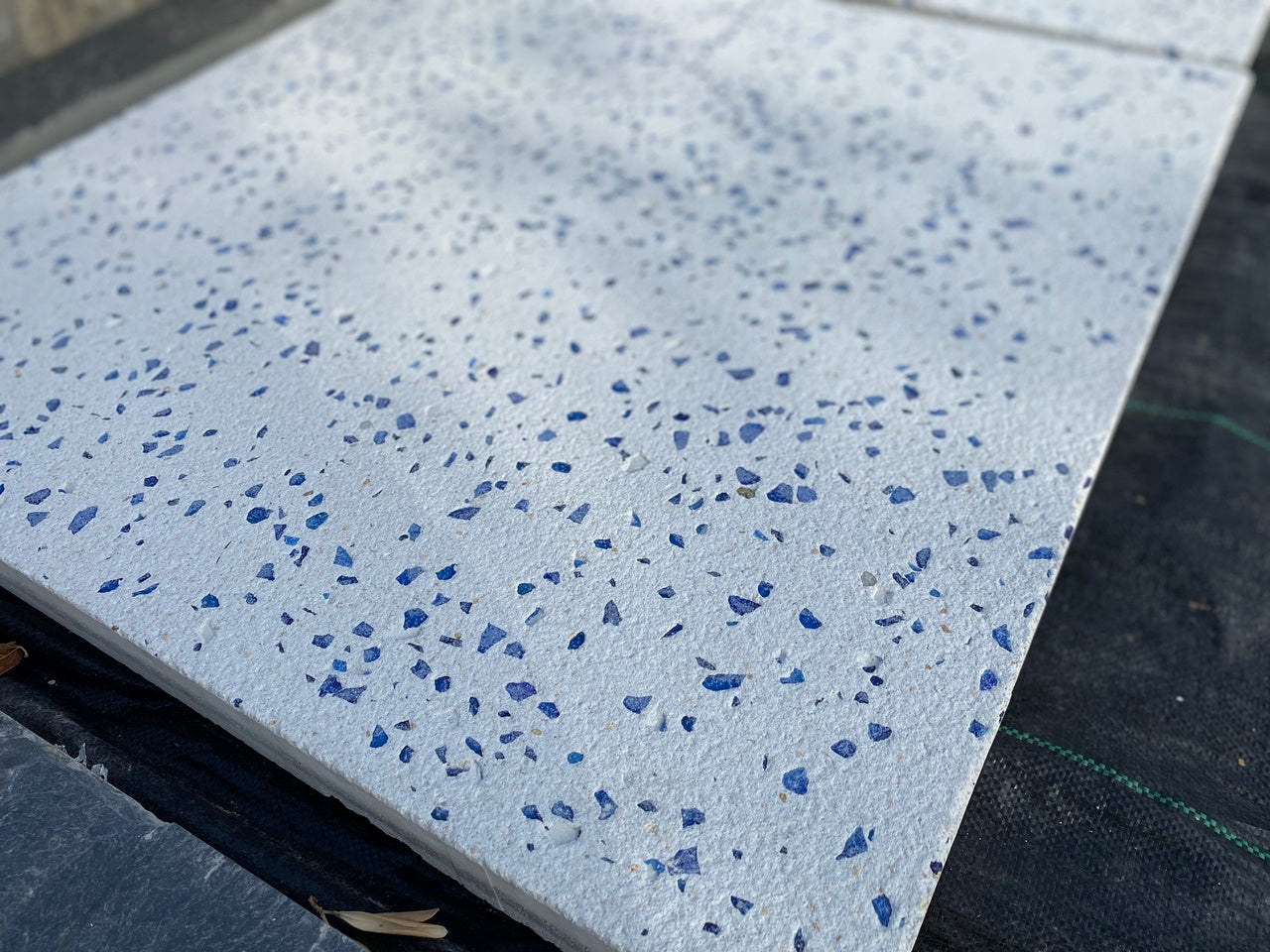 Losa de hormigón blanco con trozos de cristal azul 75x75x5 cm.